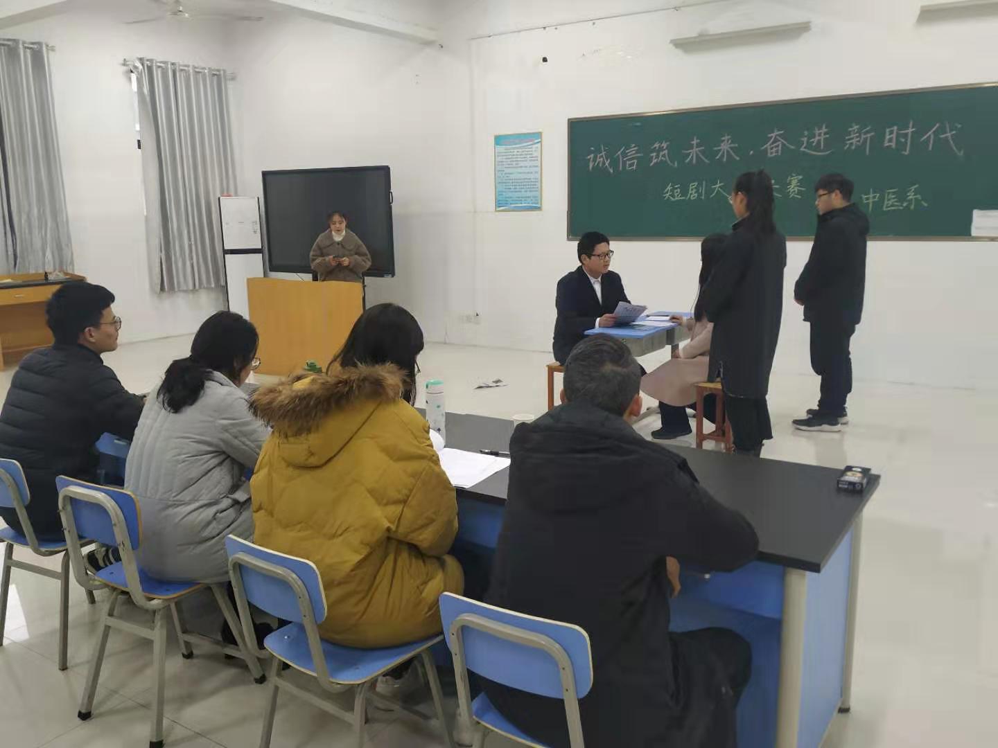 2019年11月27日下午,中医系在仲景东区中楼举办以“诚信铸未来,奋进新时代”为主题的短剧大赛。方梦舟老师、华原俊老师、学生会副主席王名扬同学、申俊恒同学担任此次评委,共有五组参赛选手参加此次比赛。