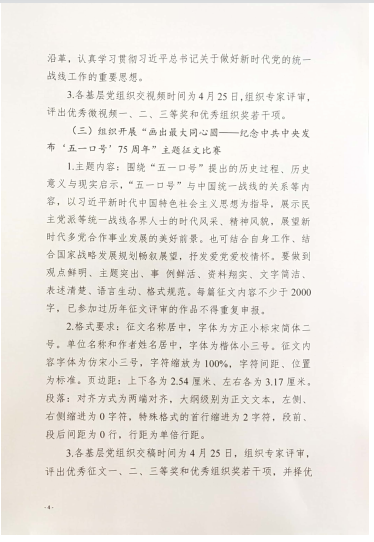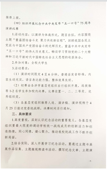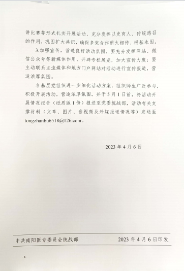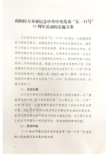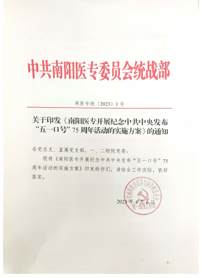 关于印发《南阳医专开展纪念中共中央发布“五一口号”75周年活动的实施方案》的通知