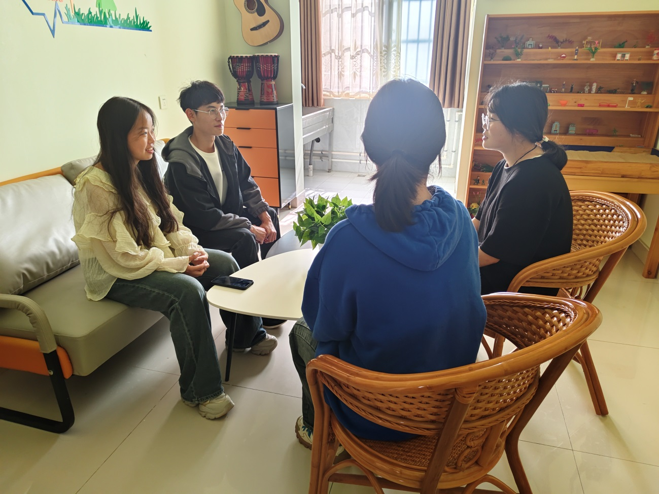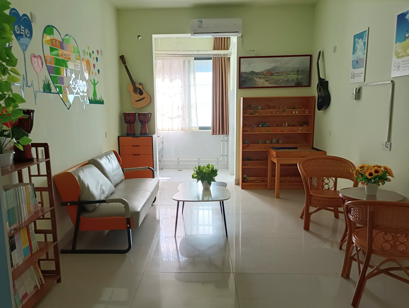 “心语医馆”二级心理辅导站目前设有谈心谈话区、团体辅导区、休闲阅览区、沙盘游戏区、音乐治疗区、中医情志理疗区等多个功能区域。室内主要设施包括沙盘、心理健康书籍、中医情志理疗器具、吉他、非洲鼓、葫芦丝等,环境优美温馨舒适,是中医系学生进行自我心理教育的有效平台,是我系开展心理健康教育的主要载体。
