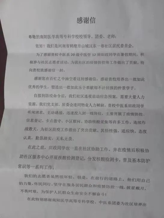 一份来自基层社区的感谢信,纸短情长,字里行间给与高度评价,好样的田政,学校以你为荣!